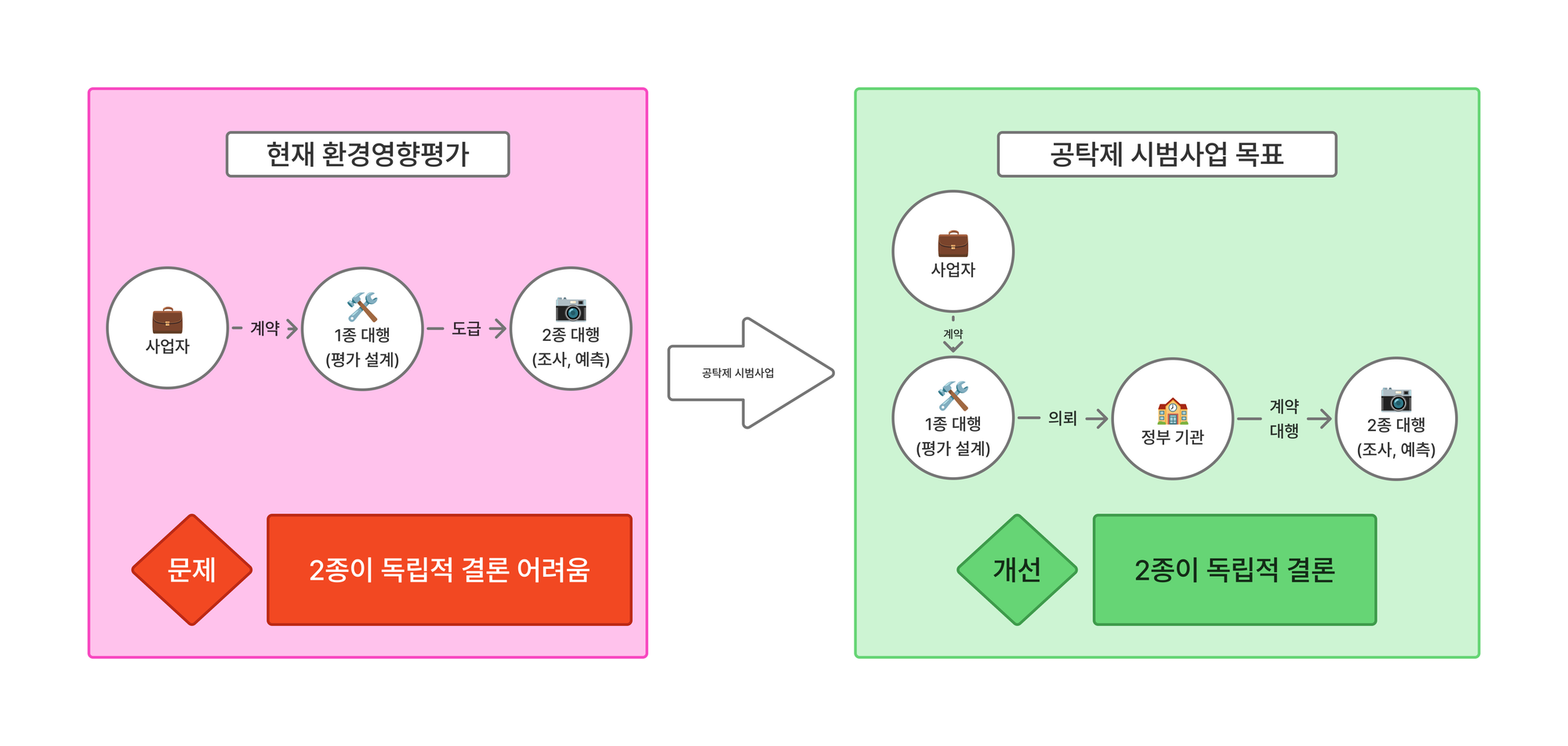 정부의 허가를 받아 환경영향평가를 수행할 수 있는 대행업체는 1종과 2종으로 나뉜다. 1종은 평가서 작성 전반을 설계하는 역할, 2종은 현장 조사 및 예측하는 역할을 맡는다. 명목상으로는 2종이 1종으로부터 독립적인 조사를 수행할 수 있지만, 1종이 사업을 나눠주는 도급 관계가 되면서 업계에서는 사실상 1종의 입김이 절대적이라는 문제가 있었다.