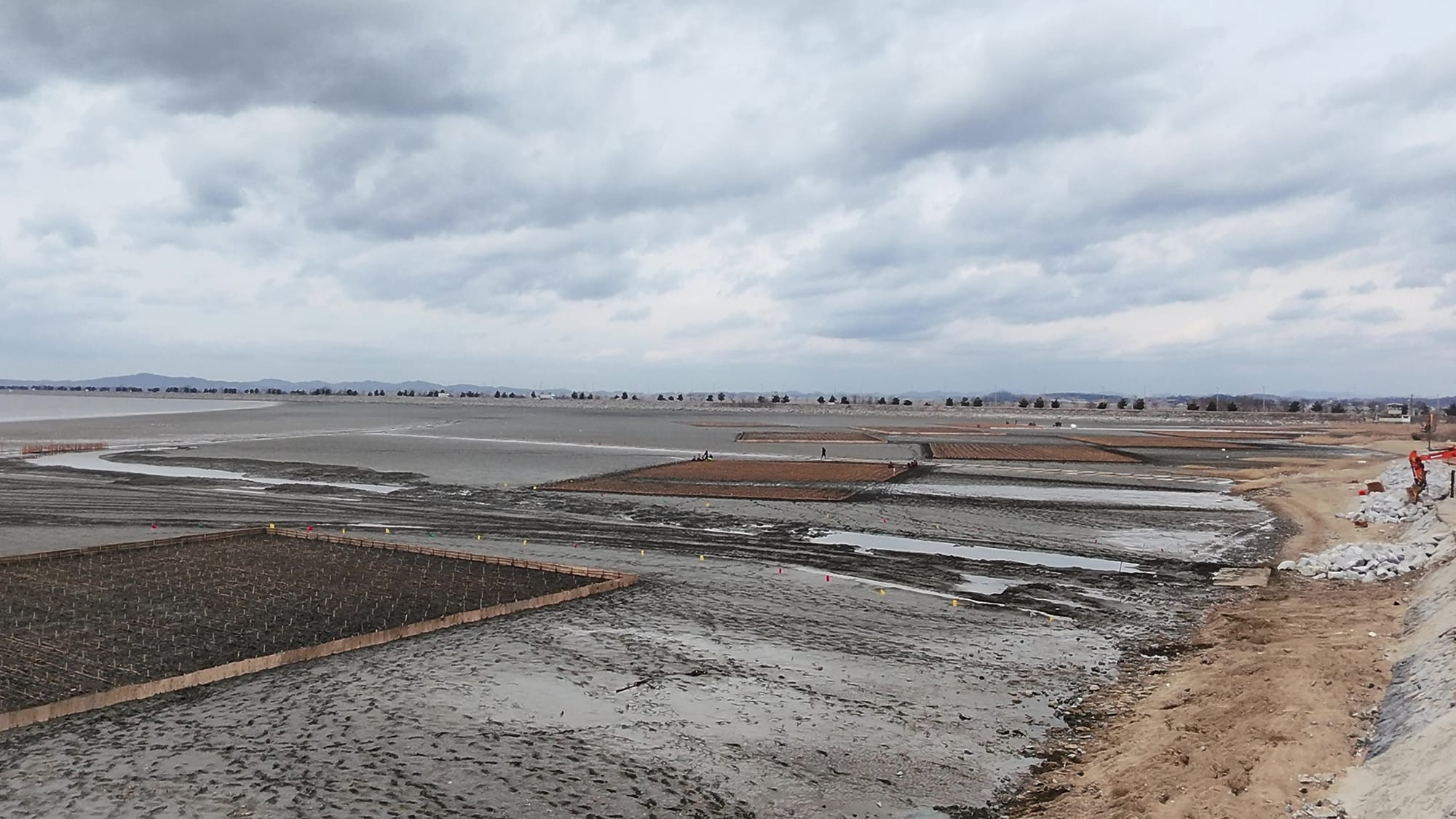 공사 전에 이 지역은 멀쩡한 갯벌이었는데요. 매년 도요와 물떼새가 찾아와 먹이원과 쉬는 장소로 활용하던 곳입니다. 아직 봄이 되지 않은 3월 초 기준이지만, 현재 도요와 물떼새가 칠면초를 심는 구간 바깥에서 무리지어 있는 걸 확인할 수 있었습니다.