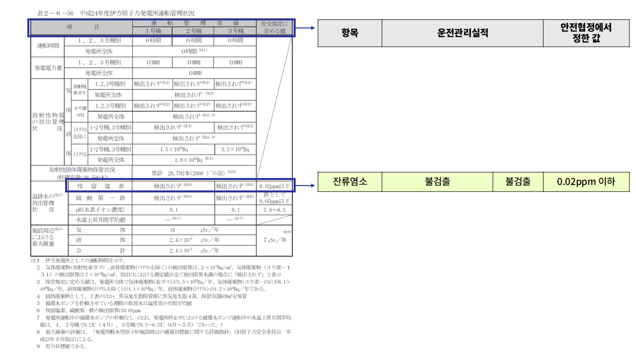 에히메현과 시고쿠전력은 해당 협정서 전문을 누구나 볼 수 있는 홈페이지에 공개하고 있다. 원문을 보면 “방수구(배출구)에서 잔류염소를 0.02ppm 이하로 유지하는 등 주변 해역의 수질에 영향을 미치지 않도록 적정 관리해야 한다”고 써 있다.