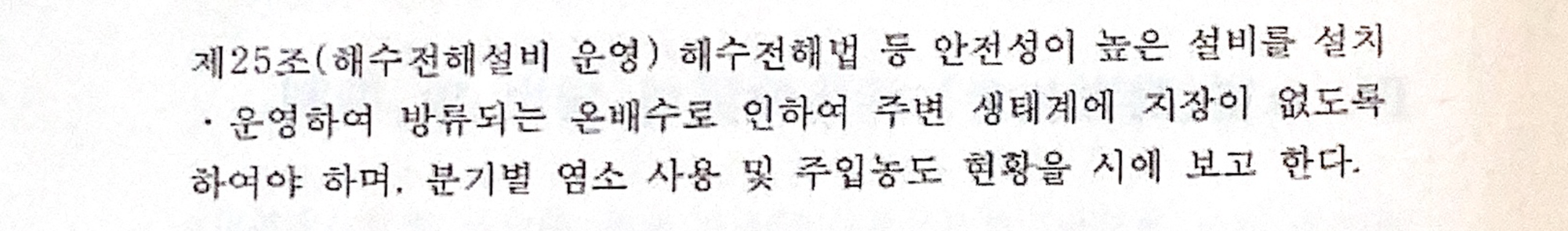 한국 발전소도 지자체와 ‘환경협정’을 맺는다. 살아지구가 입수한 영흥화력발전소와 인천광역시가 체결한 환경협정서를 보면 잔류염소에 대한 언급은 있으나 ‘기준’은 없다. 원문의 제25조 ‘해수전해설비 운영’ 항목을 보면 “분기별 염소 사용 및 주입농도 현황을 시에 보고한다”고 돼 있을 뿐 수치 제한은 없다. 어떤 수준에 도달해야 문제로 볼 것인지 기준조차 없는 것이다.