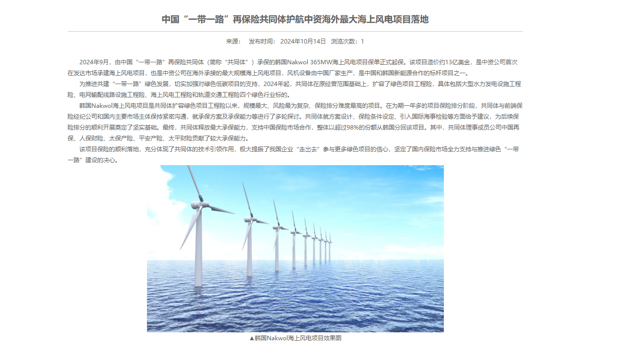 중국재보험그룹(中國再保險, China Reinsurance)은 더 구체적으로 밝혔다. 이들이 CEEC가 수행하는 EPC의 리스크를 책임지면서, 낙월해상풍력(Nakwol 365MW)을 "중국 자본이 해외에서 수주한 최대 규모 해상풍력 프로젝트"라고 명시했다. "기자재는 중국 제조사 생산이며, 98% 보험 물량을 재인수했다"고도 밝혔다. 2%만 한국 보험사에 남기고 거의 모든 보험을 중국이 제공하는 구조다.